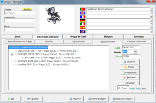 Características gerais: Gestão completa de artigos e seus sub-artigos Gestão completa de rubricas Ficha de entidades clientes/fornecedores Documentos totalmente parametrizados pelo cliente, facturas, vendas a dinheiro, recibos, notas de credito ou debito, etc, etc. Níveis de acesso a documentos assim como nas características do próprio documento. Controlo de estados de documento. Software Certificado nº 26 e 27 pela DGCI - Finanças. Gestão de lotes e grelha de cores e tamanho Tabela de preços por datas Lançamentos de custos e proveitos indirectos aos artigos Multilingua para descrição de artigos Tratamento de IVA Açores e Madeira Gestão de contas correntes de clientes e fornecedores. Envio de pagamento por cheque ou transferência bancária Tratamento de comissões de vendedores por documento ou por ficha de entidade.